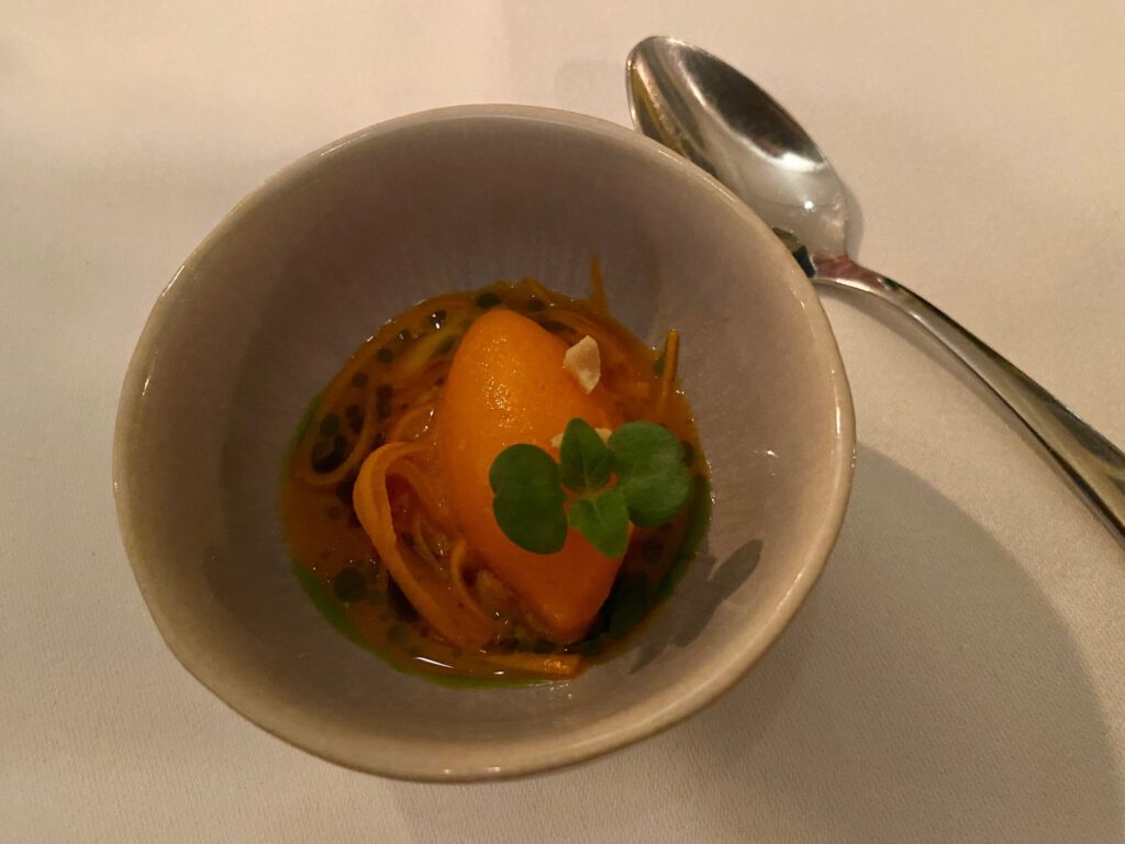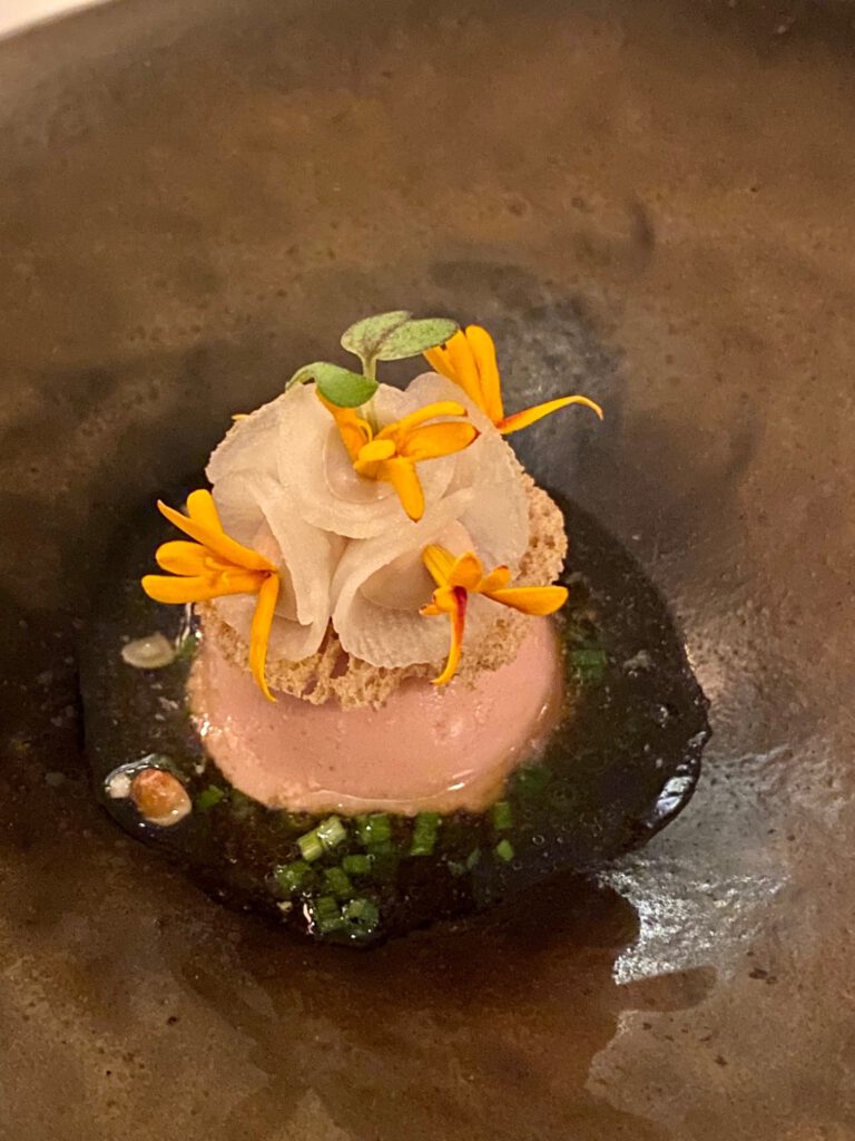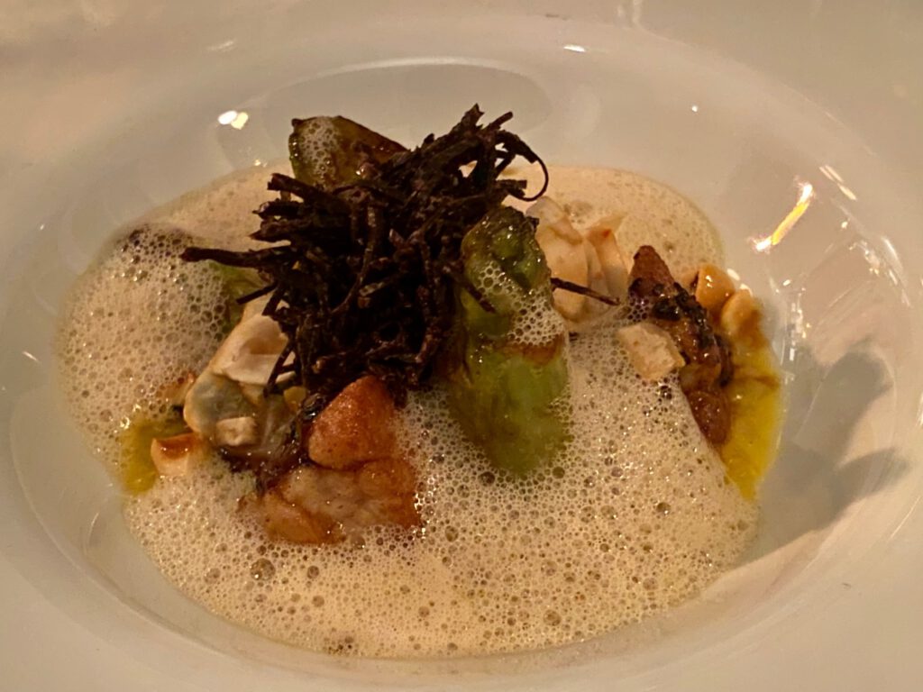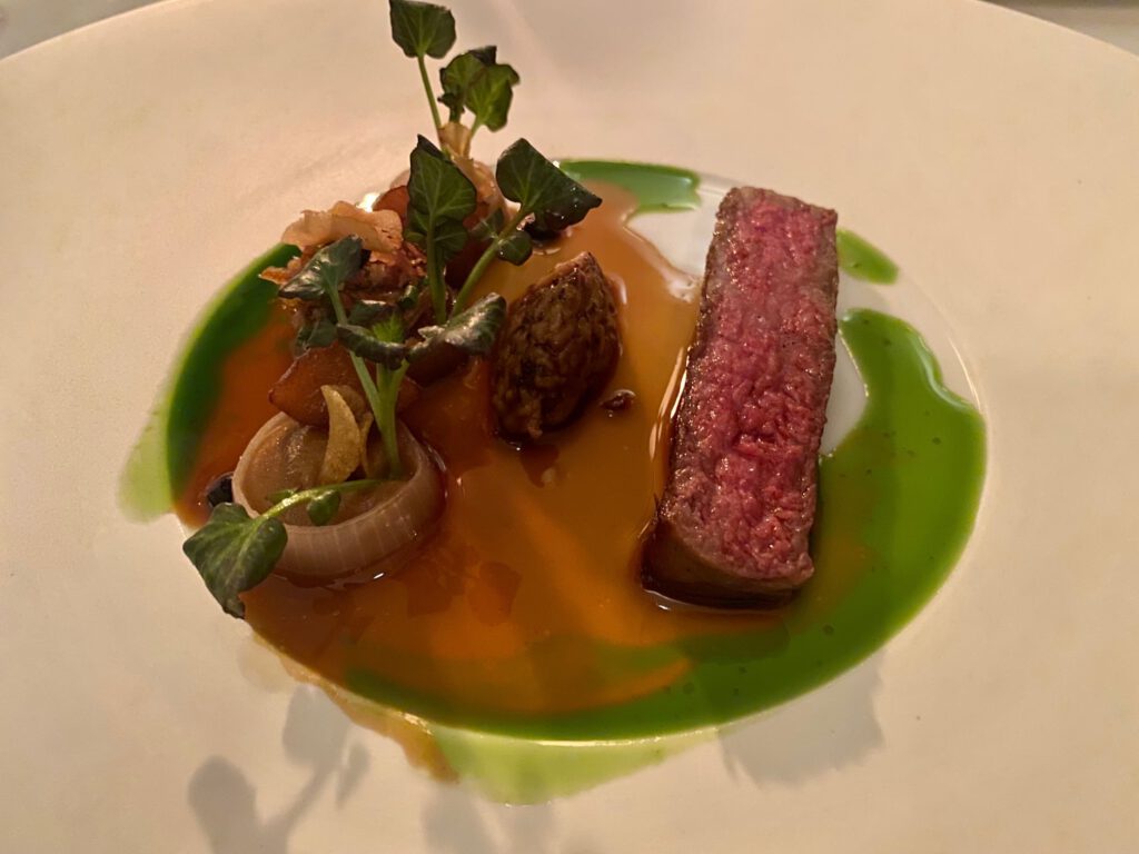 Das Perlhuhn mit Schwarzwurzel und Erdnuss (und wie alles mit Crunch – hier frittierte Hühnerhaut) war mega und das Wagyu war natürlich Top Qualität – aber durch die Kombination mit z.B. Sojazwiebeln und schwarzem Knoblauch absolut aufgewertet.