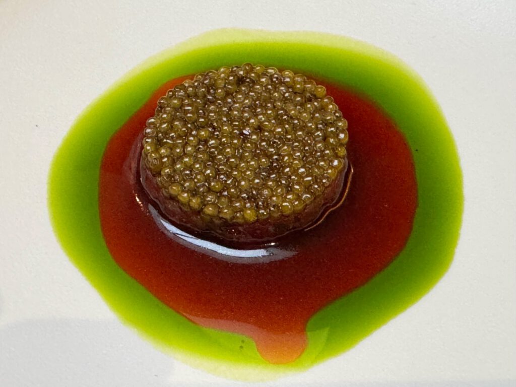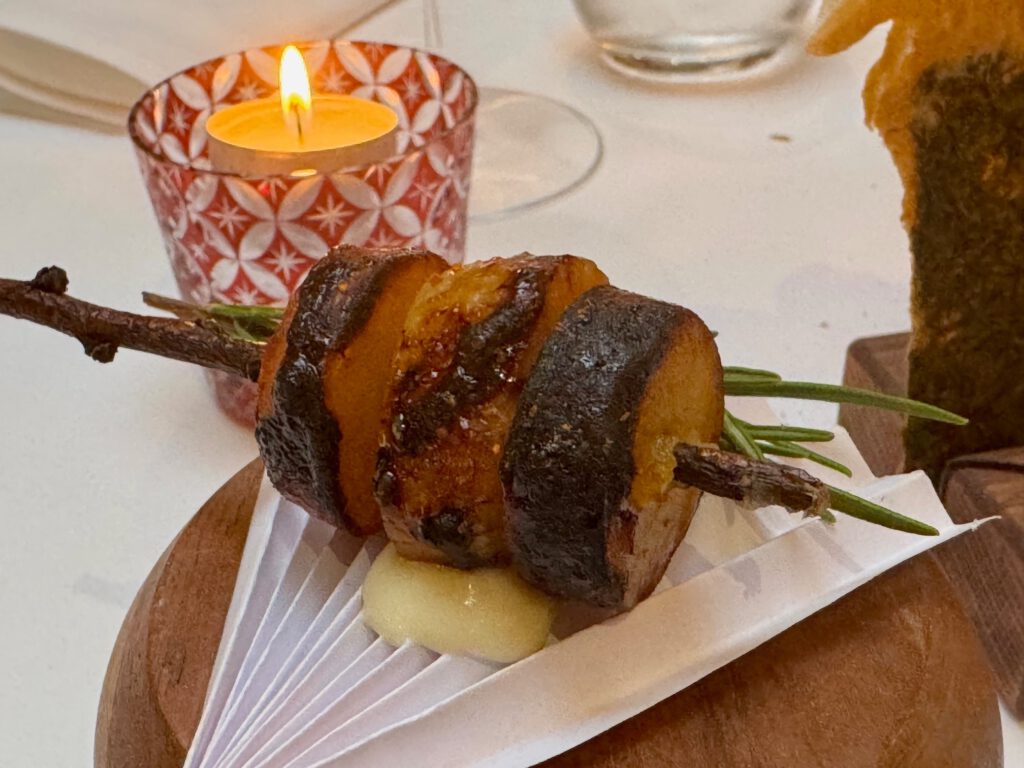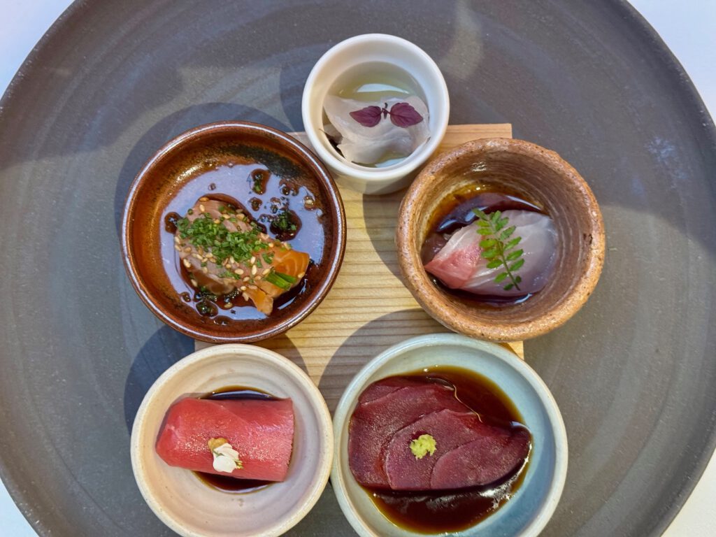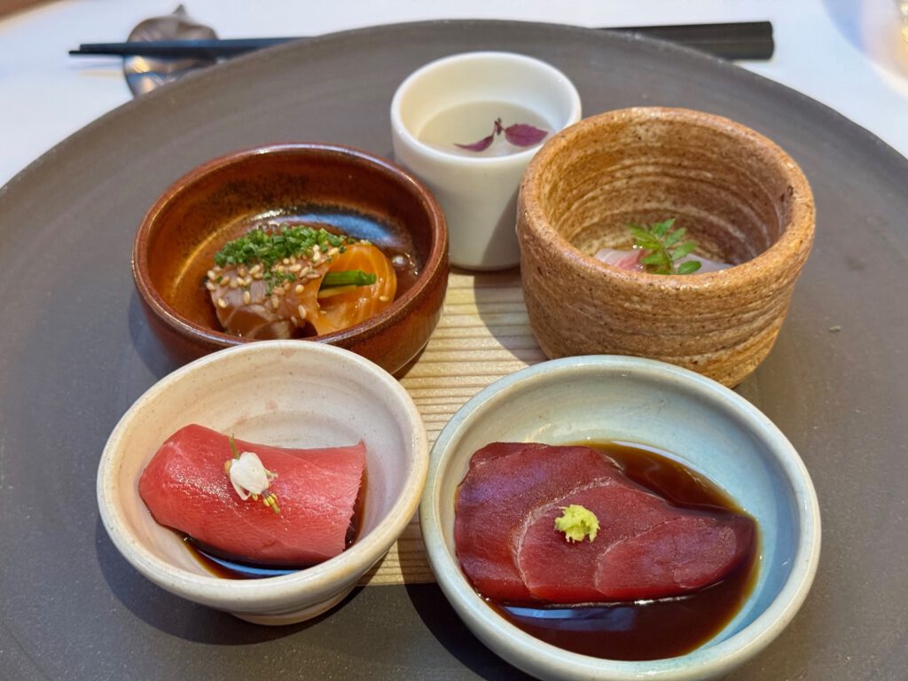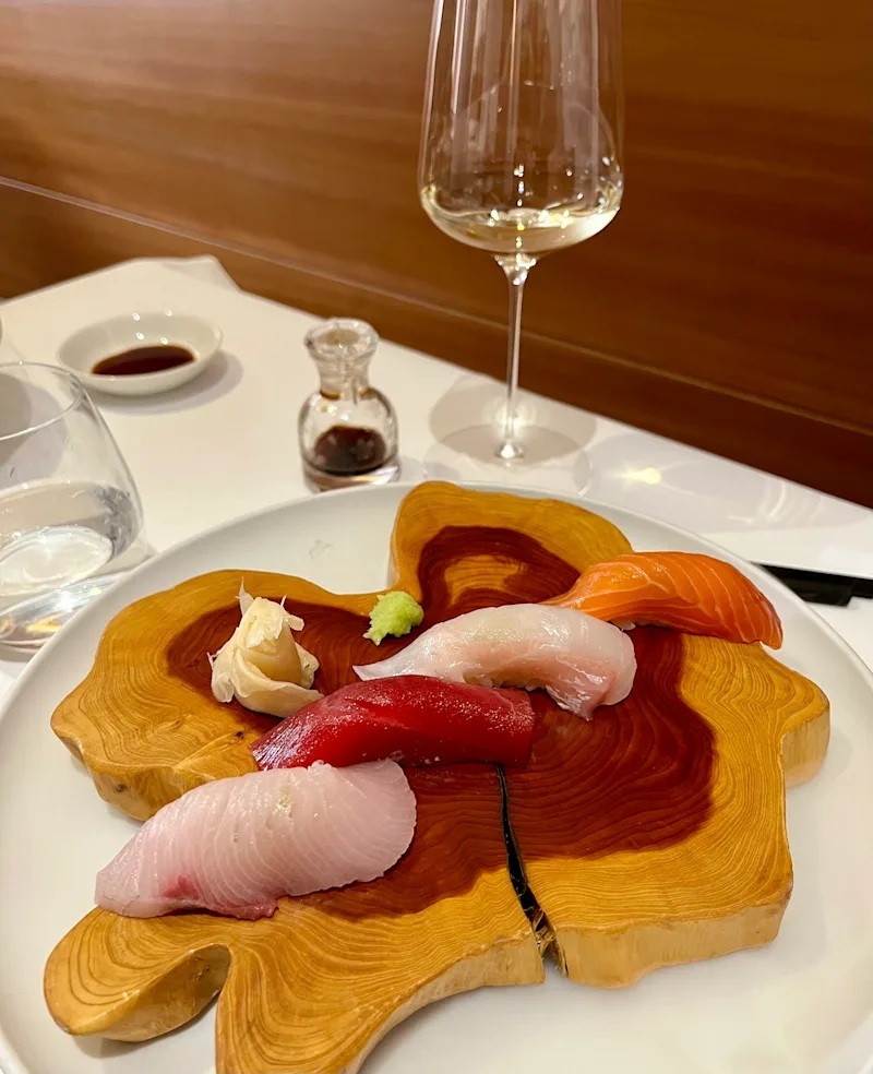 Absolut großartiges Menü – getragen von extrem hoher Produkt Qualität., aber auch immer wieder ausgefallenen Aromen-Kombinationen. Sashimi und Sushi Qualität herausragend. Die vielen kleinen Vorspeisen waren ein Feuerwerk an Aromen-Kombis – bewusst von mir sehr langsam eins nach dem anderen genossen. Die Jakobsmuschel im Teigmantel hatte ich so noch nie. Top. Zum Rind eine mega Estragon Jus. Da hätte ich mich reinsetzen können. Und einen Pralinenbaum hatte ich auch noch nicht ![]()