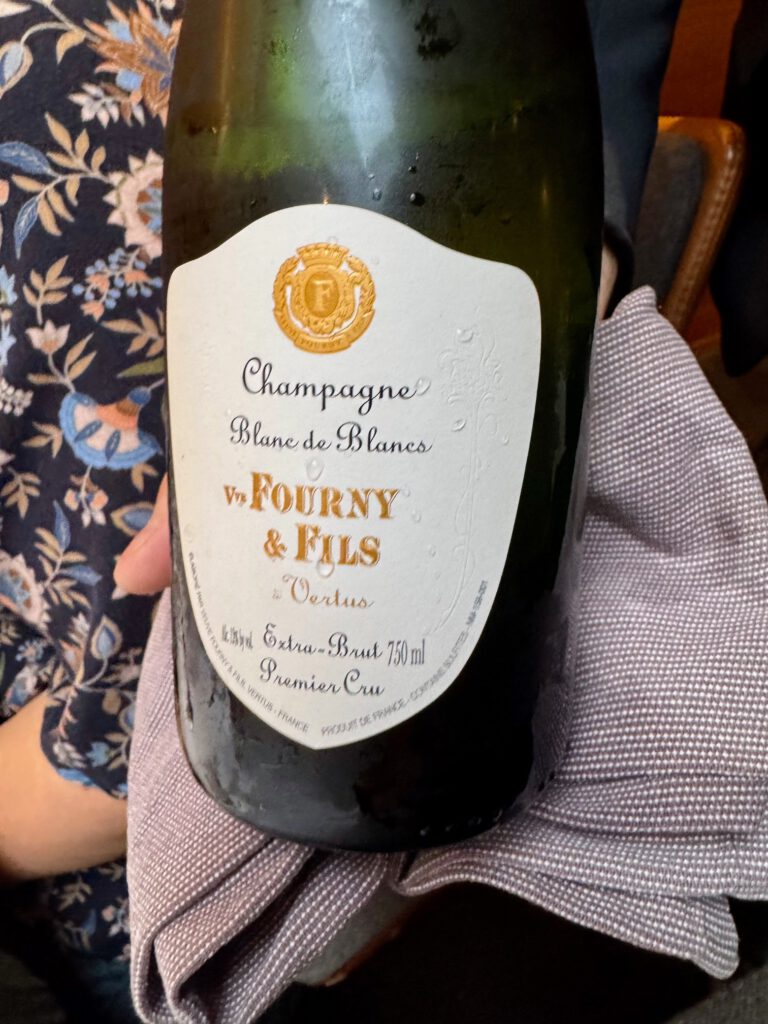Zur Begrüßung ein Glas Champagner: Veuve Fourny & Fils Blanc de Blancs Extra Brut Premier Cru. Ein kleiner Familienbetrieb in Vertus, der stark auf Terroir, Nachhaltigkeit und handwerkliche Arbeit setzt. Frisch, präzise, mineralisch. Guter Start in den Abend.