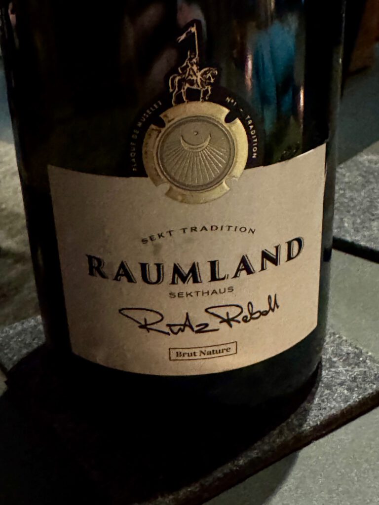 Zum Start: 2013er Pinot (Noir, Meunier, Gris) Brut Nature Rutz Rebell von Raumland. Über 120 Monate Hefelager. Unfiltriert.