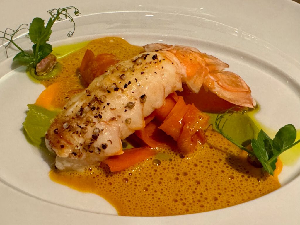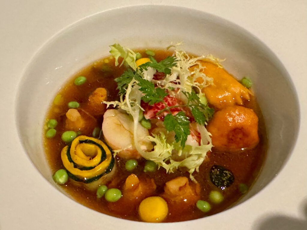 Blauer Hummer mit Hummerconsommé, gegrillter Zucchini und Erbsen