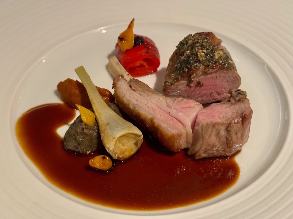 Lammrücken mit Aubergine, Paprika, Powerade und schwarzem Knoblauch