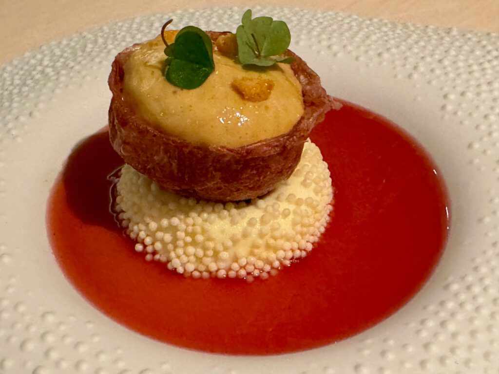 Amuse-Bouche: Römische Pastete mit Rindertatar und Sauce Béarnaise.