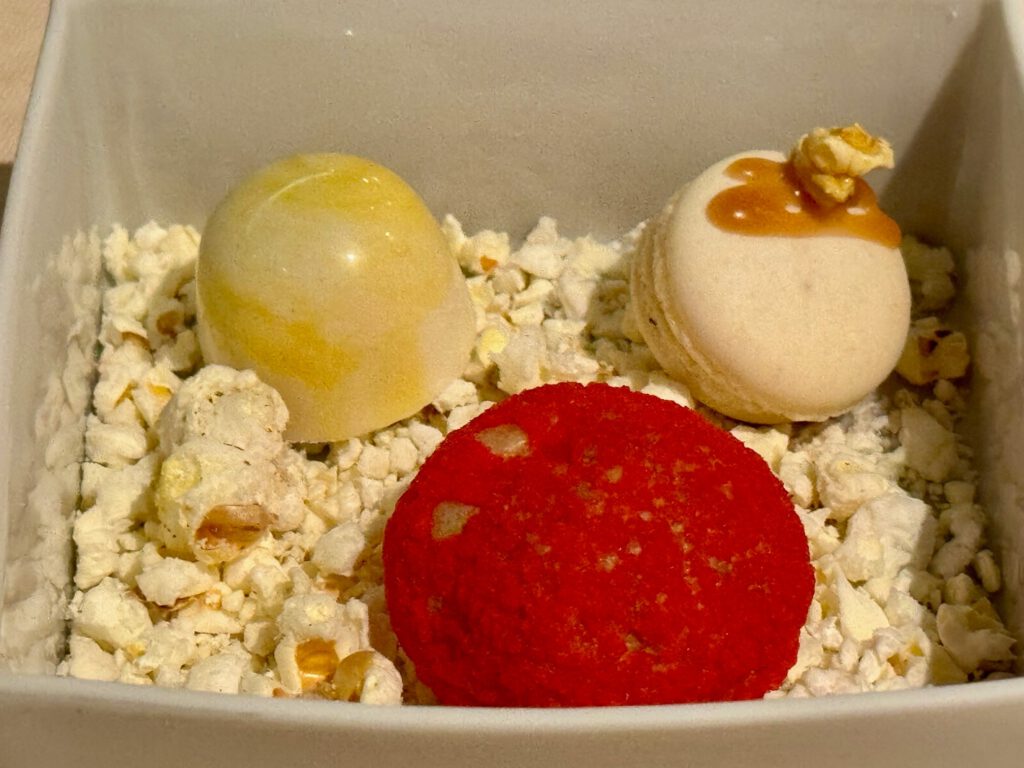 Popcorn Orgie: Windbeutel mit Schokolade und Popcorn. Popcorn Praline. Macaron Salzkaramell und Popcorn