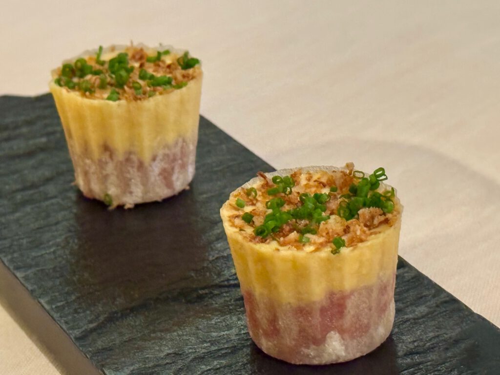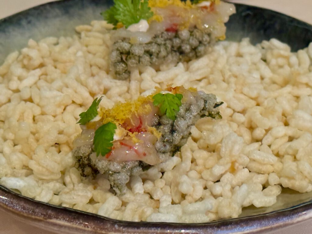 Amuse-Bouche: Nori-Tapioka mit Bottarga und roter Garnele
