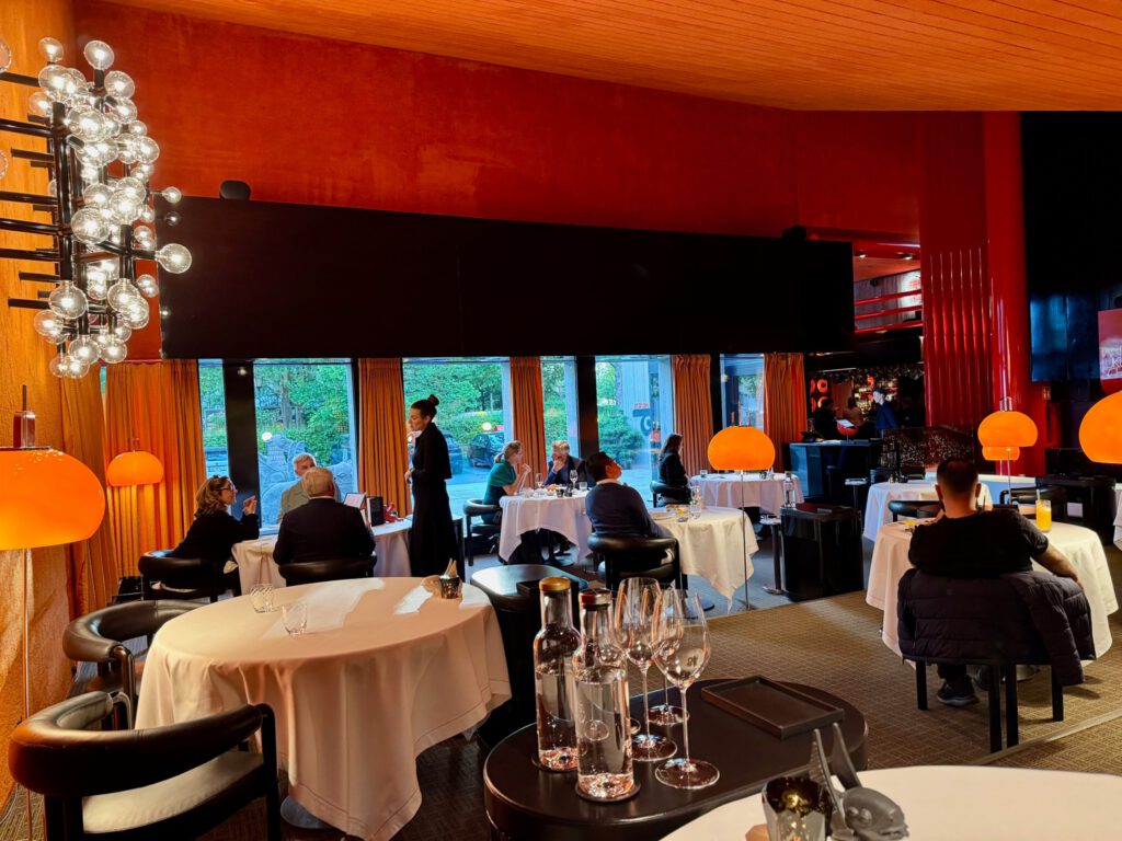 Schon beim Betreten fällt das Tantris durch sein auffälliges, fast futuristisch-psychedelisches Design der 70er Jahre auf. Orangefarbene Teppiche an den Wänden und der Decke. Geometrische Formen und auffällige Kunst. Irgendwie ein lebendiges Gesamtkunstwerk. Ikonisch.