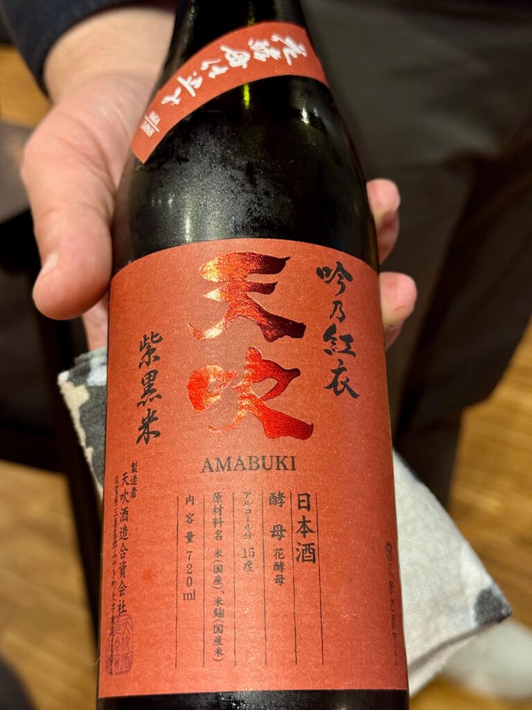 Dazu gab es einen roten Sake (shikokumai): Amabuki – Gin no Kurenai (Saga, Kyushu). Sehr beerige Aromen
