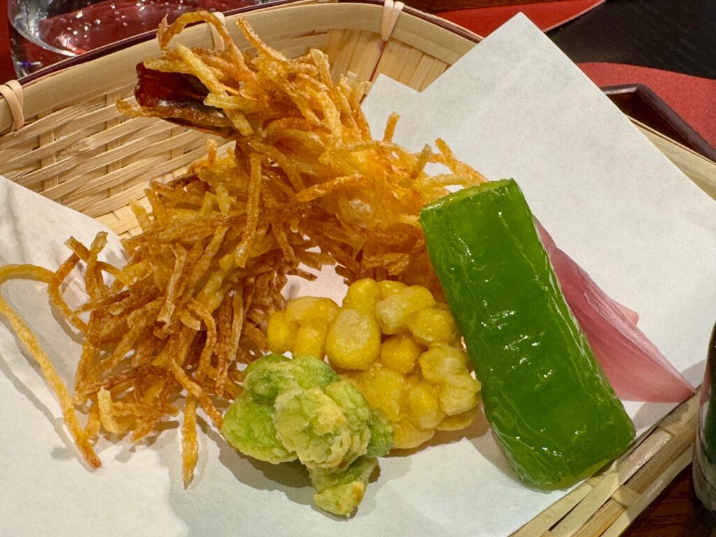 Frittierte Garnele im Kartoffelfadenteig mit Gurkensauce, Edamame und Mais