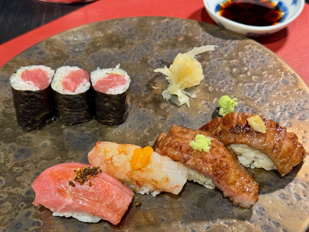 Sushi Selektion von Chef Taka: Nigiri mit Chutoro Thunfisch, Garnele, Wagyu, Tekka-Maki
