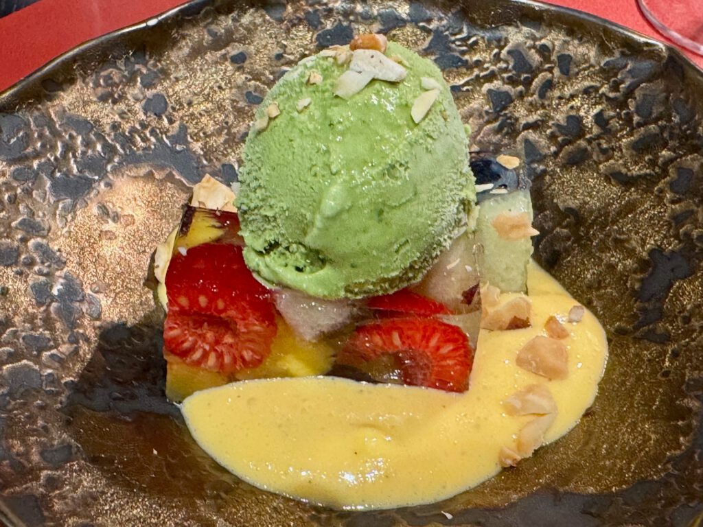 Dessert: Matcha Eis | Früchte in Weißweingelee | Vanillesauce | Nüsse