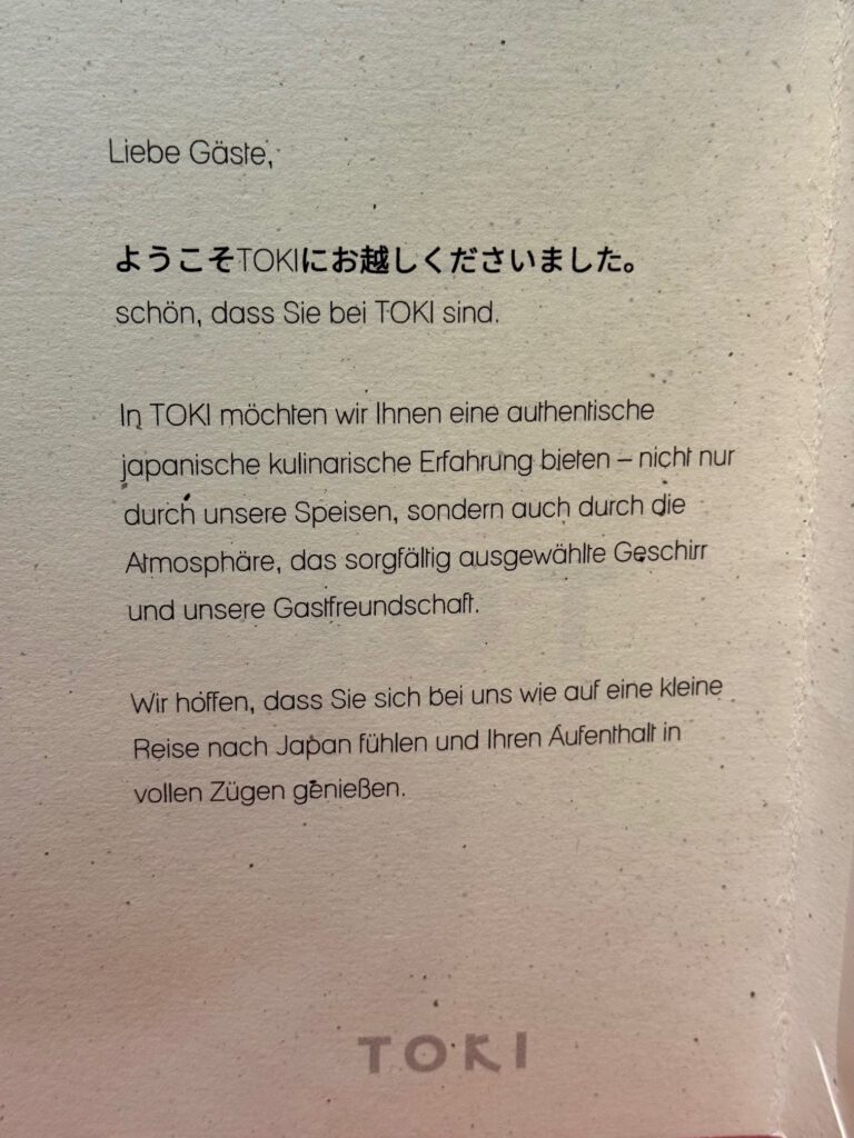 Gestern Abend war ich bei Hideyuki Takahashi im Restaurant Toki in Köln. Im Mai frisch eröffnet. Und ich war begeistert. Wir hatten ein 7 Gang Omakase Menü. Beeindruckend gut. Als Begleitung kann man zwischen Wein, Sake und Tee wählen. Die Sake Karte ist – für mich als Nicht-Kenner – überragend groß. Die Weinkarte hat für mich – wenn ich die Messlatte von Menü und Sake Karte nehme – noch deutlich Luft nach oben.