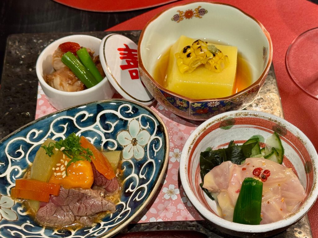 Zensai Platte: Rinderfilte shabu shabu | Oktopus | Meeresfrüchte mit Nuta | Mais-Tofu