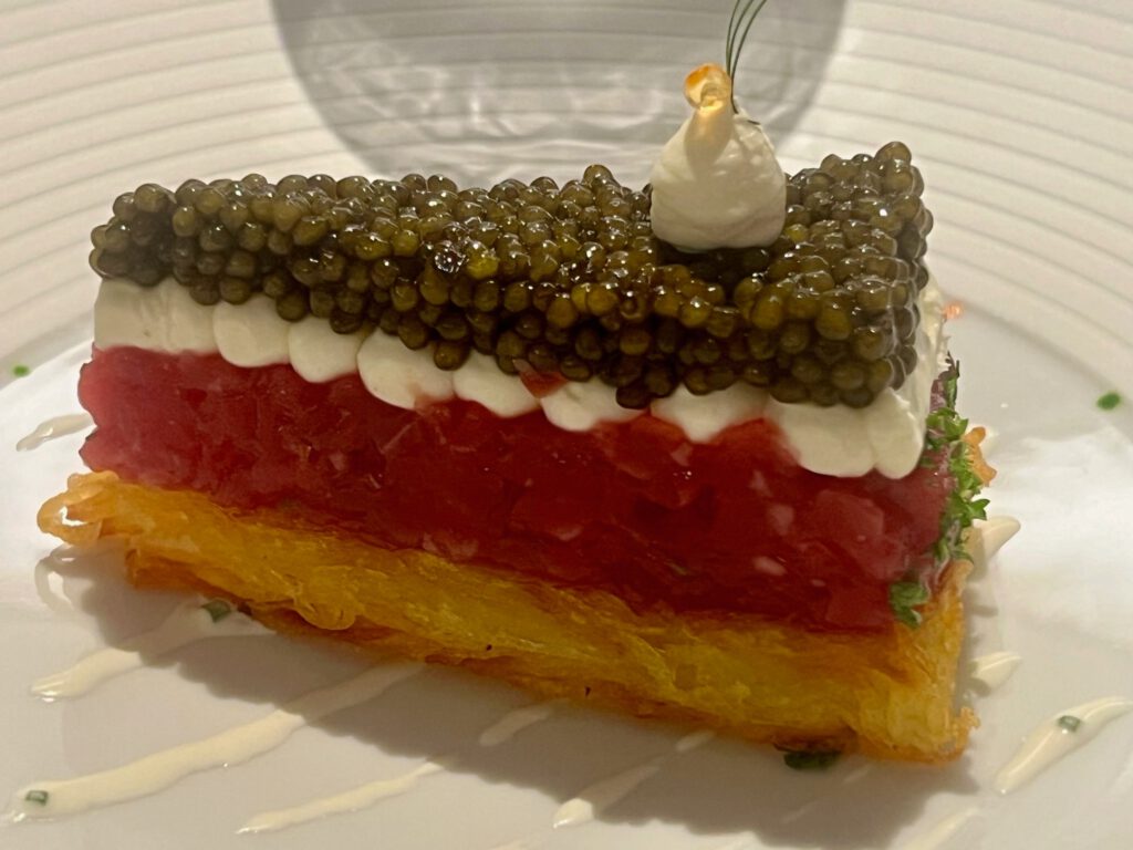 Kleine Torte vom Rinderfilet-Tartar mit N25 Caviar “Selection Sonnora auf knusprigem Kartoffelrösti