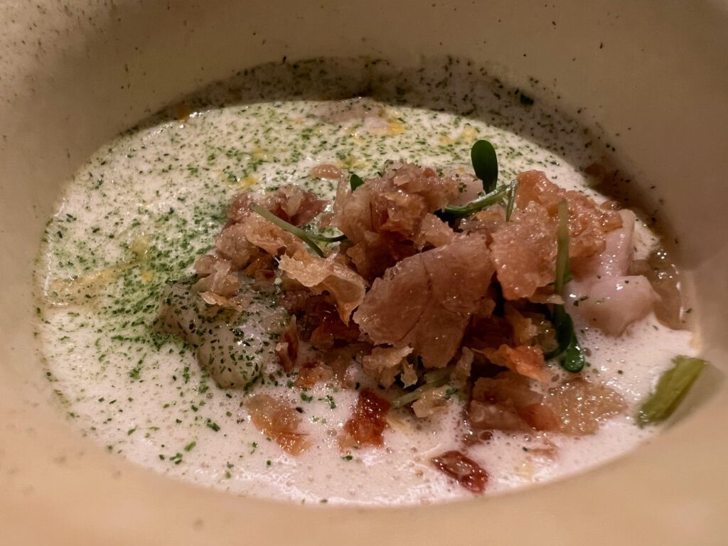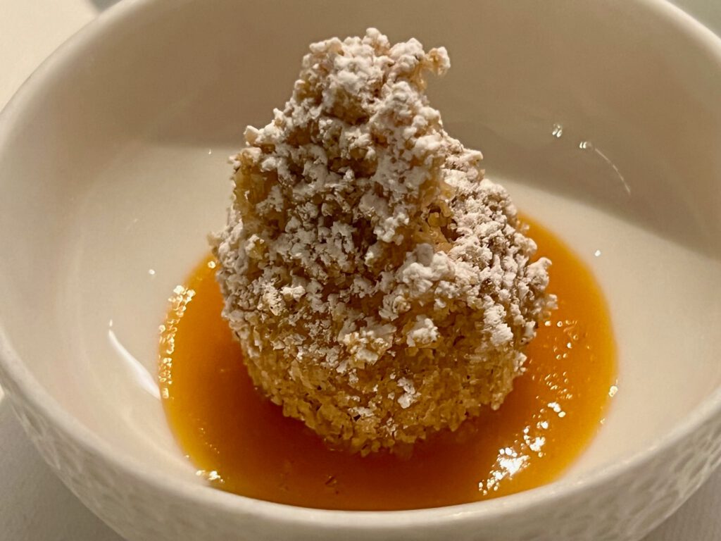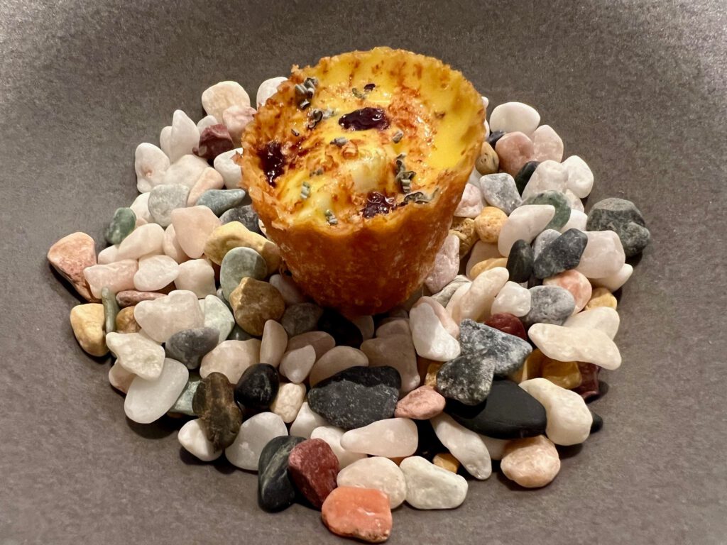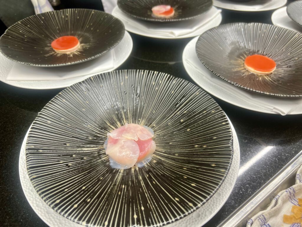 St. Jakobsmuscheln aus Dieppe, Gänseleber und Périgord-Trüffel in 2 Gängen serviert (gekühlt und warm): St. Jakobsmuschel “Facon Rossini” mit Yuzu aus Tokushima