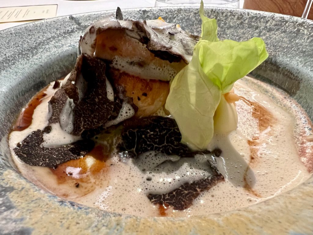 St. Jakobsmuscheln aus Dieppe, Gänseleber und Périgord-Trüffel in 2 Gängen serviert (gekühlt und warm): Scheiben von Jakobsmuscheln und Gänseleber mit roh marinierter Pflaume. Limonen-Marinade und Haselmuss-Öl