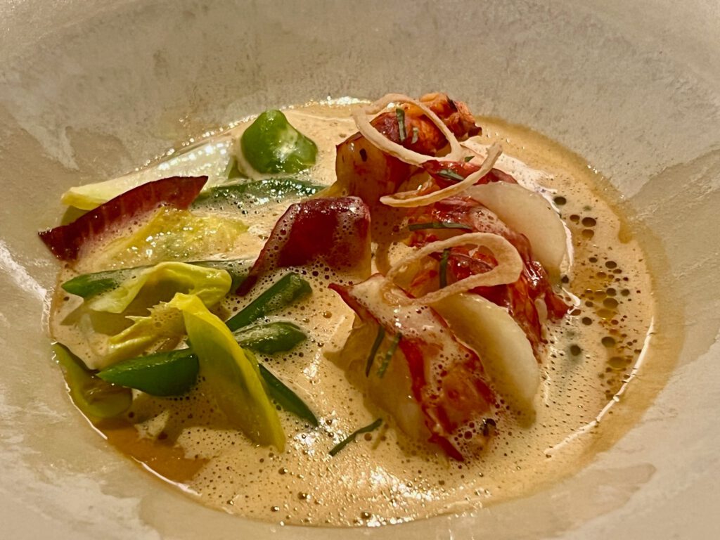 Kleiner Eintopf vom Hummer aus Saint Malo mit Bohnen, Endivie, geschmortem Chicorée, eingelegter Birne und Lauch-Öl