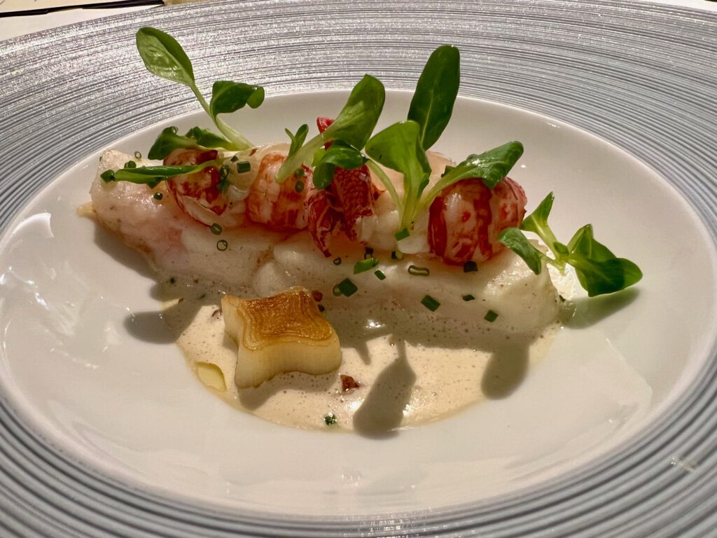 Steinbutt aus der Vendée und belgische Flusskrebse mit Feldsalat, Lardo, Walnüssen, Sauce vom gegrillten Lauch und Beurre Noisette