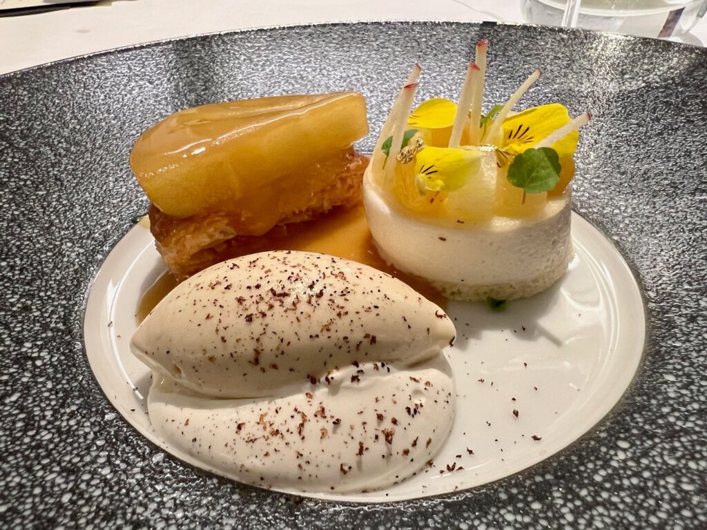 Geschmorter Apfel und knuspriger Blätterteig mit Creme von Mandel und Tonkabohne, warmem Salzbutter-Karamell und Rahm-Eis mit altem Calvados parfümiert